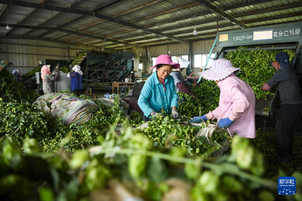 9月5日,新疆生产建设兵团第二师铁门关市二十七团天湖镇农户在工厂分拣啤酒花。