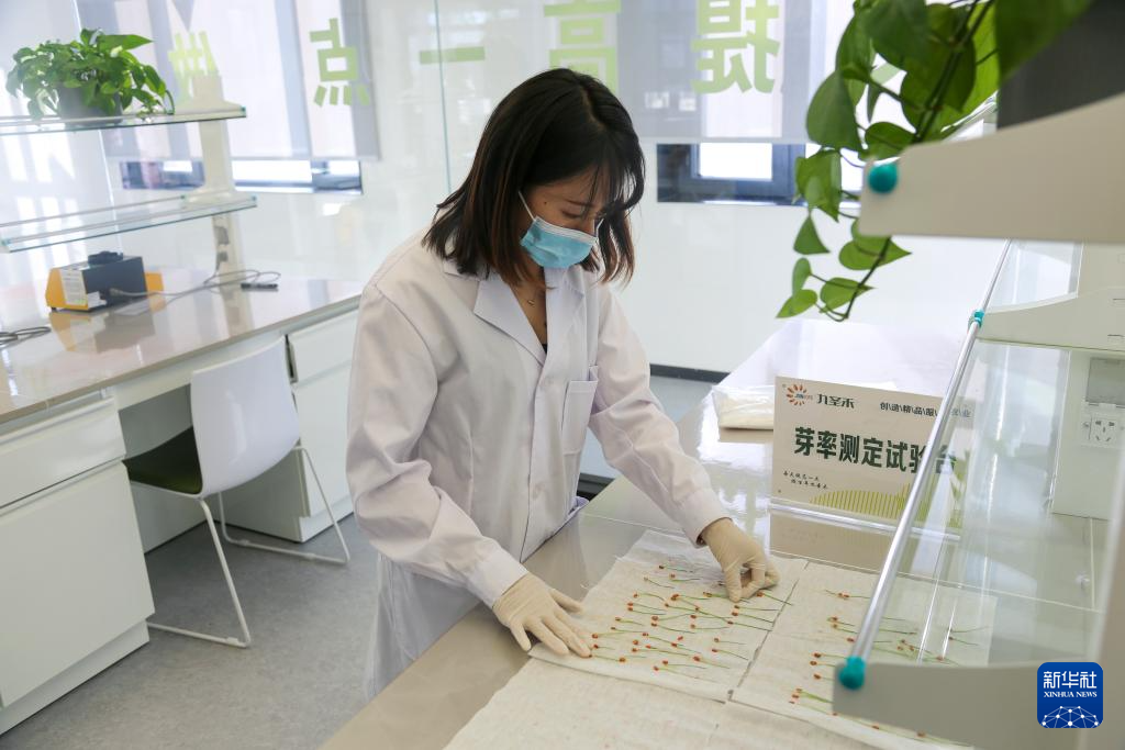 9月9日,技术人员在新疆生产建设兵团第九师白杨市一家制种公司实验室检测种子发芽率。
