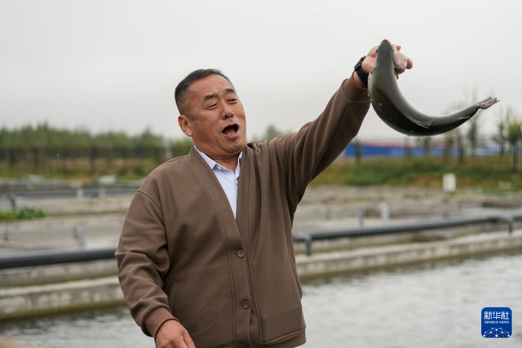 9月7日,新疆生产建设兵团第五师双河市一家渔业养殖基地工作人员展示刚刚捕捞的虹鳟鱼。