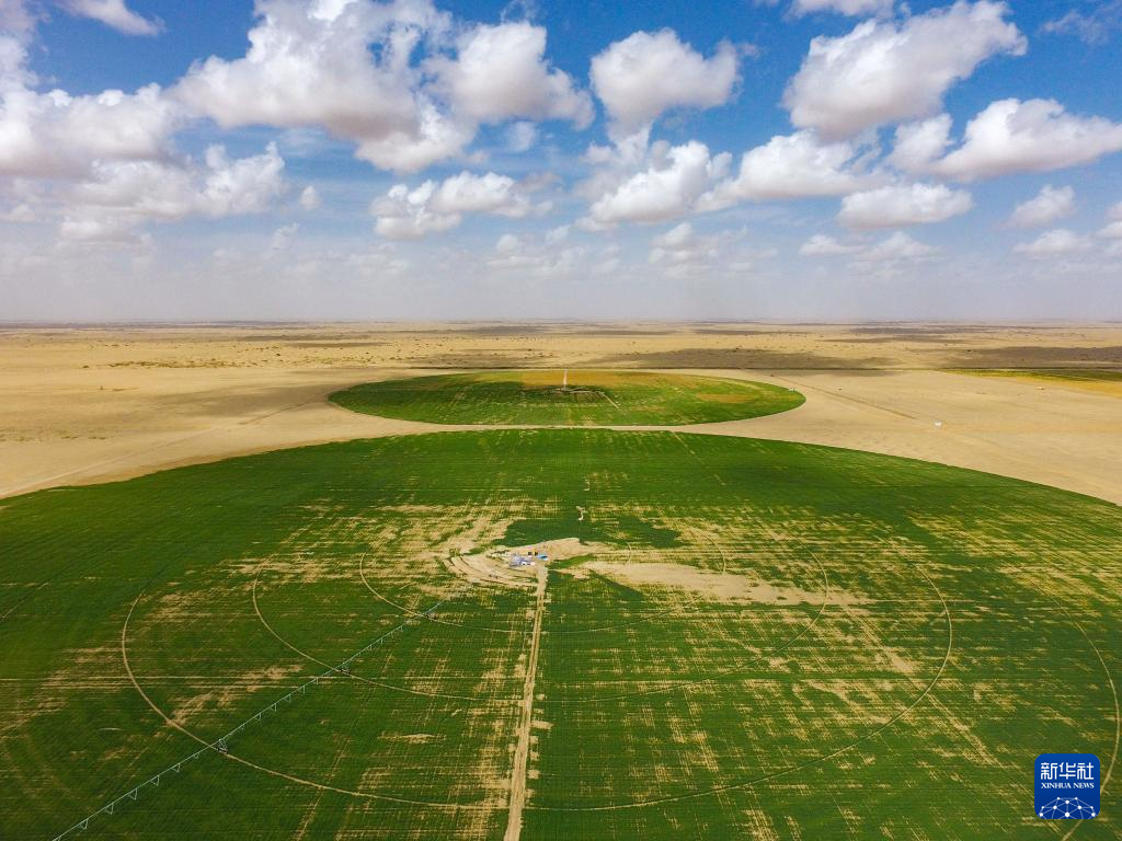 这是9月4日在新疆生产建设兵团第十四师昆玉市二二四团玉园镇拍摄的苜蓿饲草种植项目(无人机照片)。当地通过在沙漠戈壁种植饲草,起到防风固沙作用。