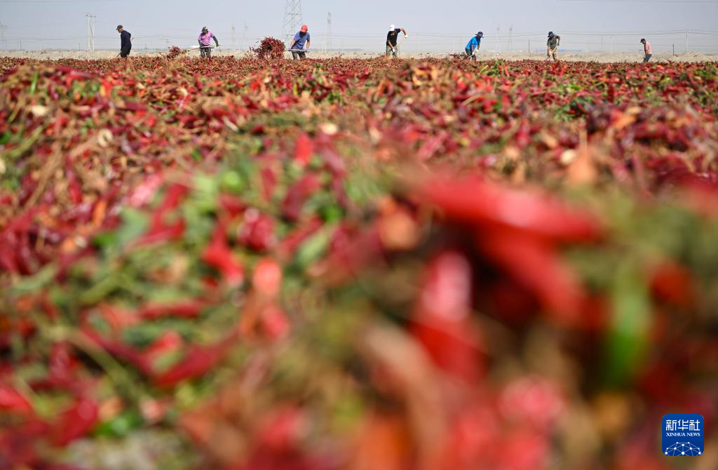 9月6日,新疆生产建设兵团第二师铁门关市二二三团开泽镇农户在辣椒产业园翻晒辣椒。
