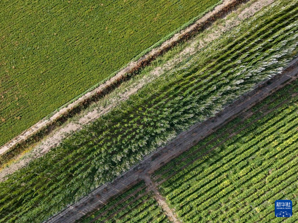 这是9月5日在新疆生产建设兵团第二师铁门关市二十五团拍摄的一处农田(无人机照片)。防风林带居中,左侧为辣椒地、右侧为葡萄地。