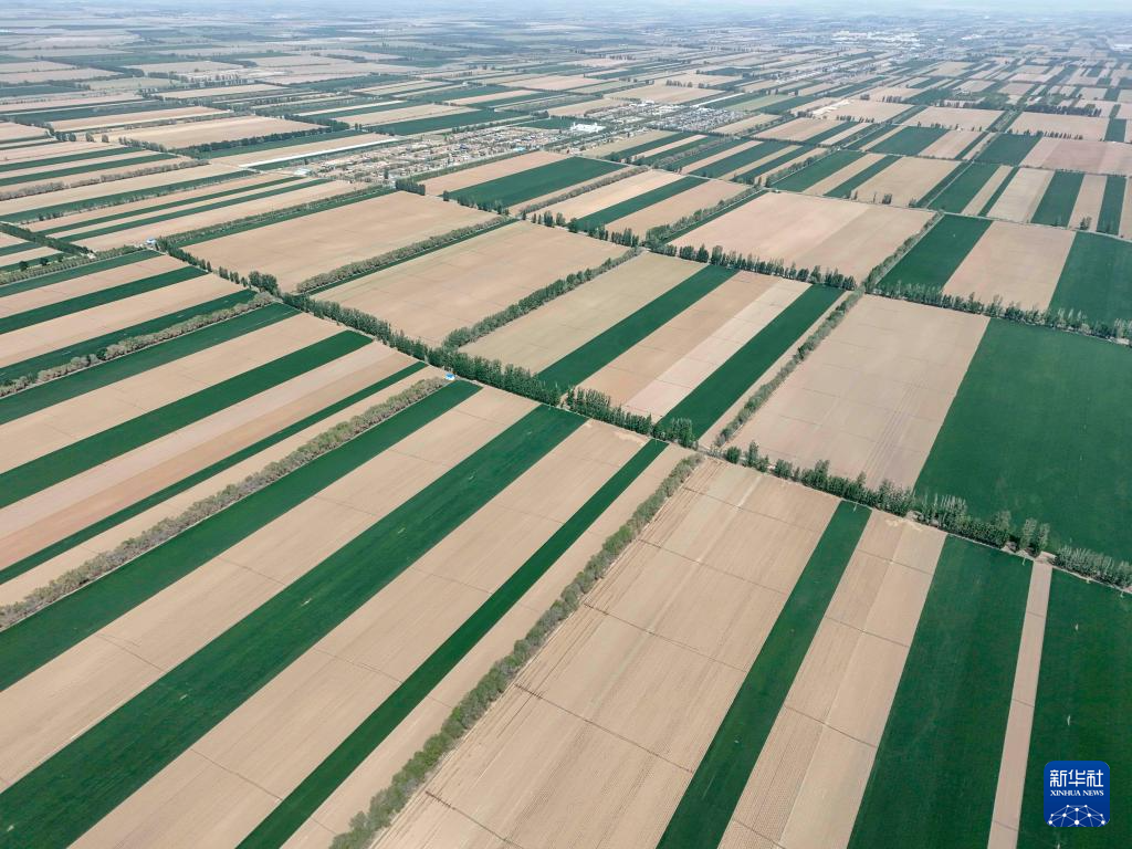 新疆生产建设兵团第六师五家渠市奇台农场种植着小麦、玉米等作物的农田(5月13日摄,无人机照片)。