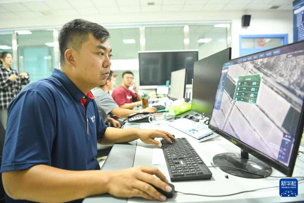 9月5日,新疆生产建设兵团第二师铁门关市二十二团河畔镇一家农业科技企业工作人员远程查看一处棉田的墒情、气温等数据。