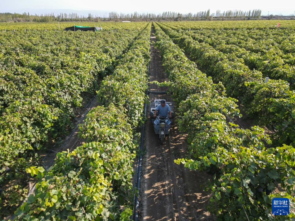 9月6日,新疆生产建设兵团第五师双河市八十一团双桥镇的果农在运送葡萄(无人机照片)。