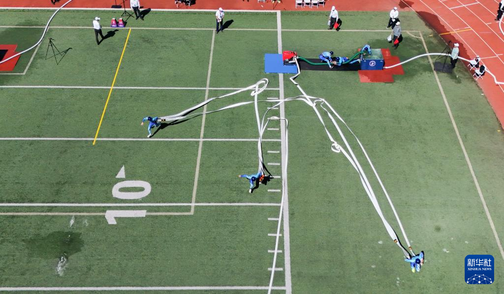 9月10日,参赛选手在进行手抬机动泵出水打靶比赛(无人机照片)。