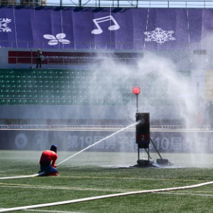 9月10日,参赛选手在进行手抬机动泵出水打靶比赛。