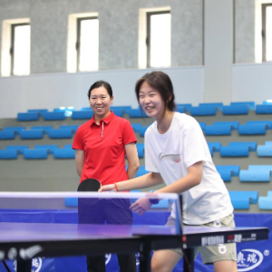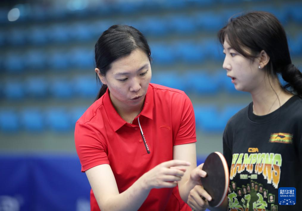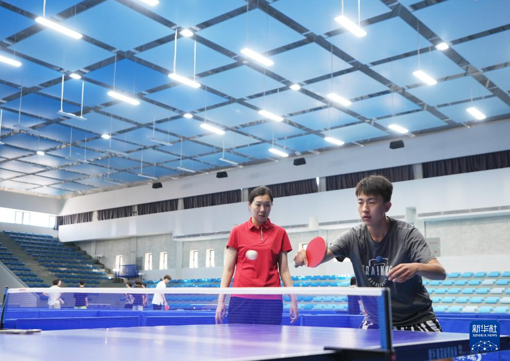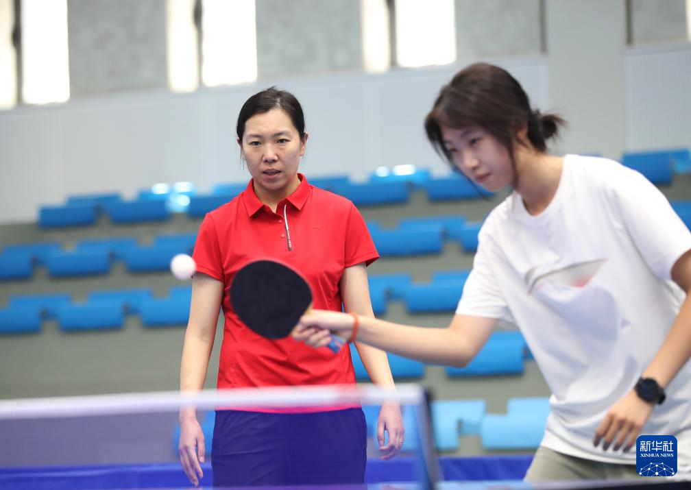 李晓霞(左)在沈阳大学指导大学生打乒乓球(2024年8月28日摄)。