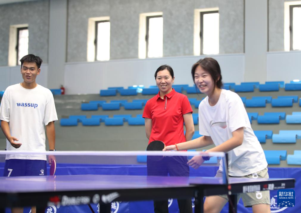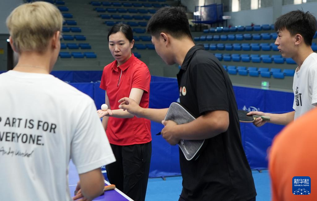 李晓霞(中)在沈阳大学指导大学生打乒乓球(2024年8月28日摄)。