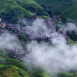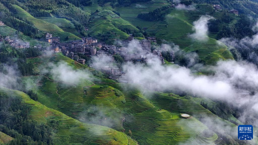 一场秋雨过后,广西龙胜各族自治县龙脊梯田云雾缭绕,云海、梯田、吊脚楼构成一幅幅美丽的田园画卷。
