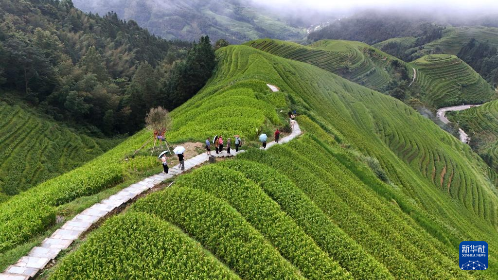 9月9日,游客在龙脊梯田景区游览(无人机照片)。
