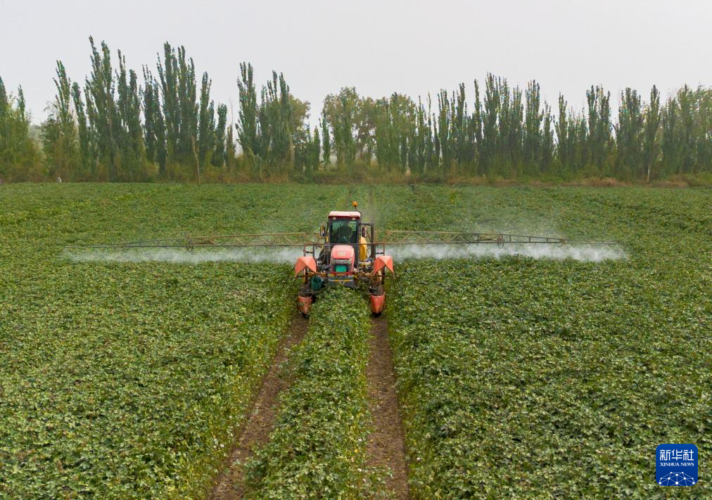 9月9日,阿拉尔市花桥镇棉花种植户驾驶农机喷洒脱叶剂。