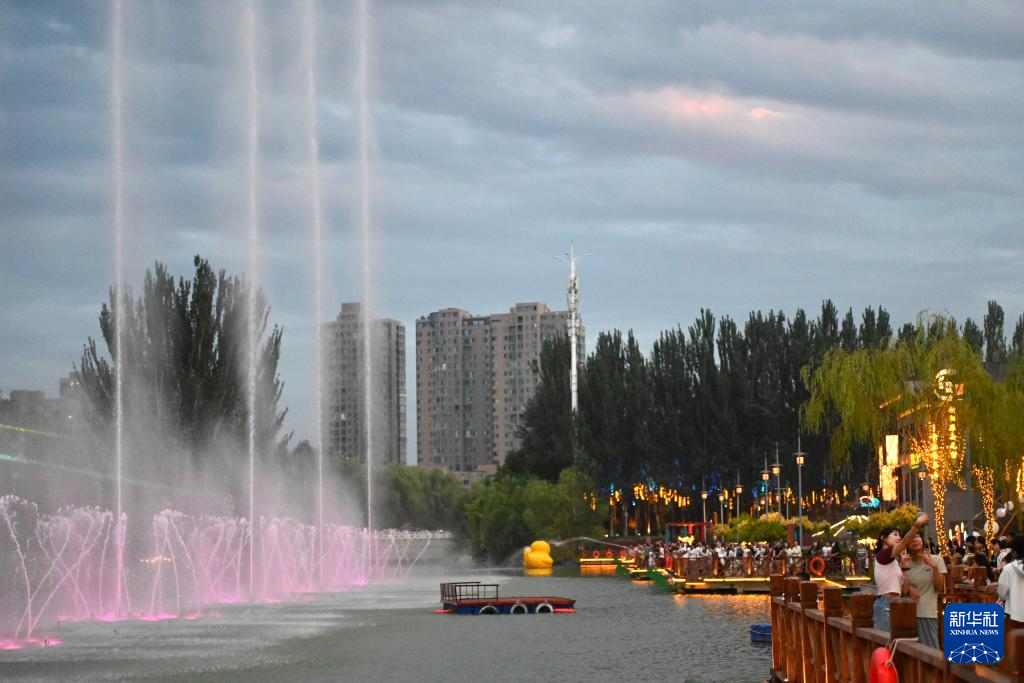 7月8日,游客在宁夏银川凤凰幻城观赏典农河上的水幕光影秀。