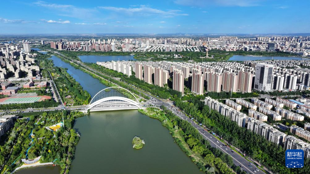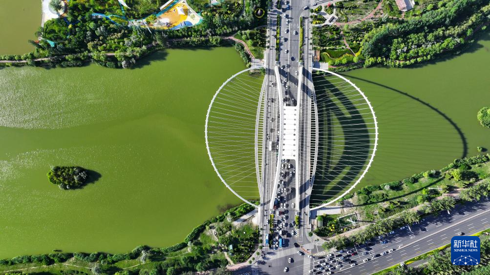 这是6月23日拍摄的宁夏银川市典农河与凤凰桥(无人机照片)。