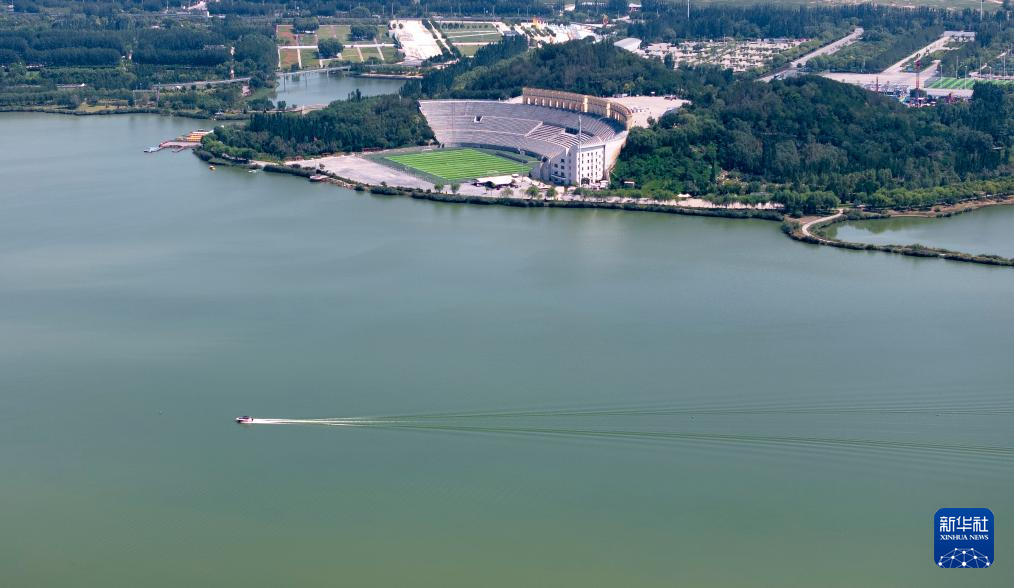 市民在银川市宝湖国家城市湿地公园乘船休闲(8月21日摄,无人机照片)。