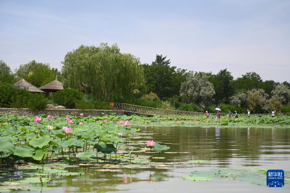 7月13日,游客在位于宁夏银川的鸣翠湖国家湿地公园赏荷。