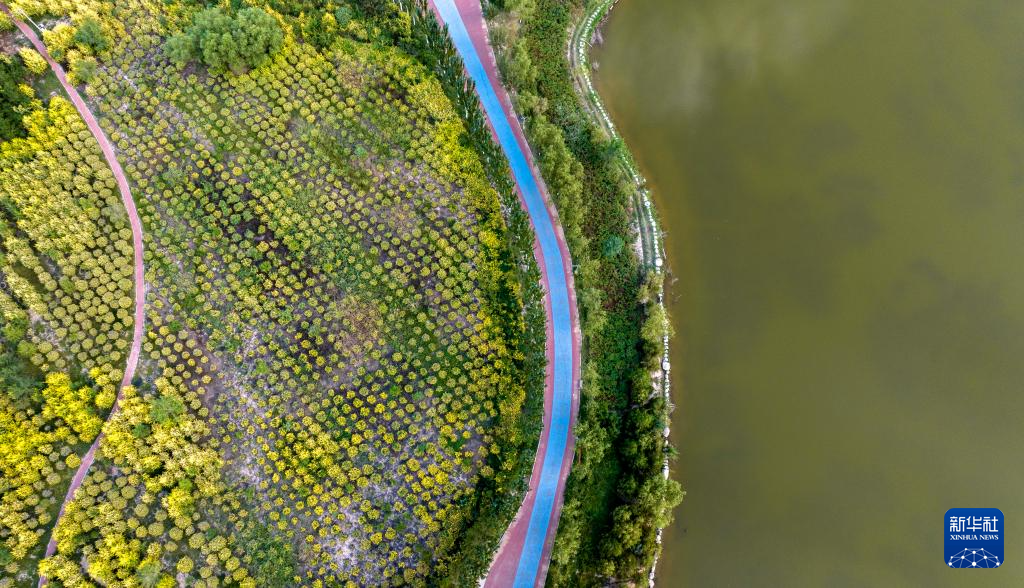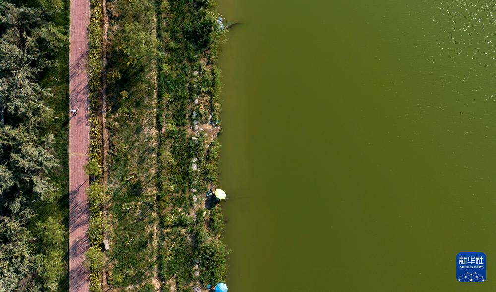 这是8月22日拍摄的位于银川市兴庆区的孔雀湖和湖边的健身步道(无人机照片)。