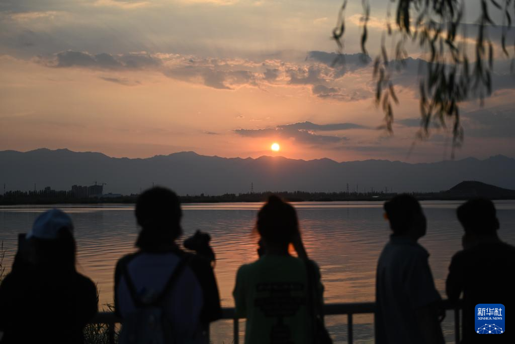 7月10日,游客在宁夏银川阅海湖畔的览山公园观赏贺兰山日落。