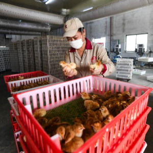 9月10日,工作人员在位于海南省文昌市东路镇的海南(潭牛)文昌鸡孵化厂挑选文昌鸡苗。