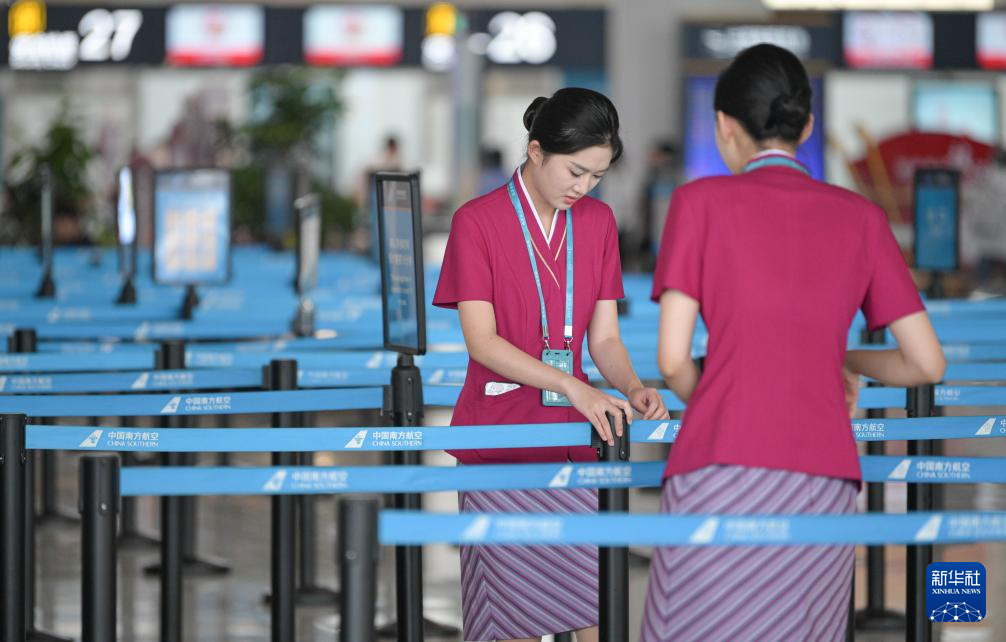 9月11日,南方航空工作人员在海口美兰国际机场2号航站楼为旅客办理行李托运手续。该航站楼目前已恢复使用。