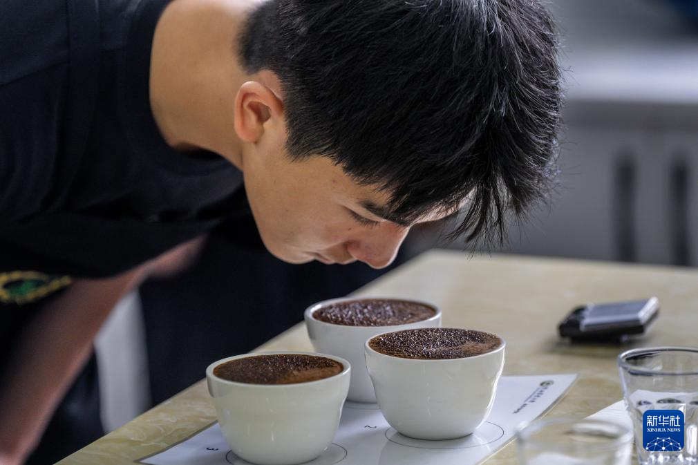 9月10日,云南农业大学热带作物学院咖啡专业学生在咖啡认知课上体验咖啡杯测。