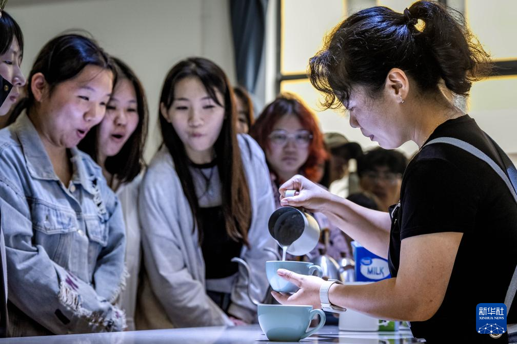 9月10日,云南农业大学热带作物学院教师黎丹妮(右)在咖啡认知课上给学生讲解咖啡拉花技巧。