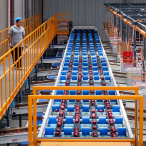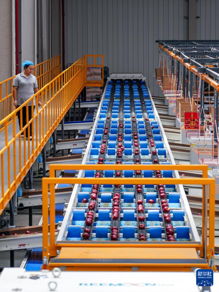9月10日,在昭通市鲁甸县一企业内,工作人员在查看机器智能分选苹果的情况。