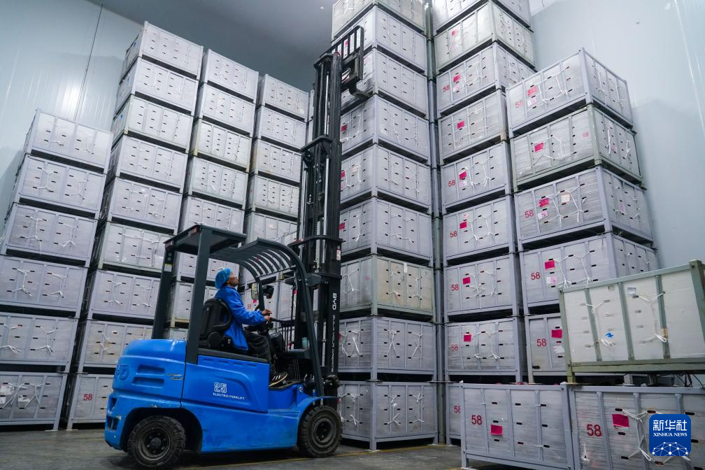 9月10日,在昭通市鲁甸县一企业内,工作人员在冷藏库内运输苹果。