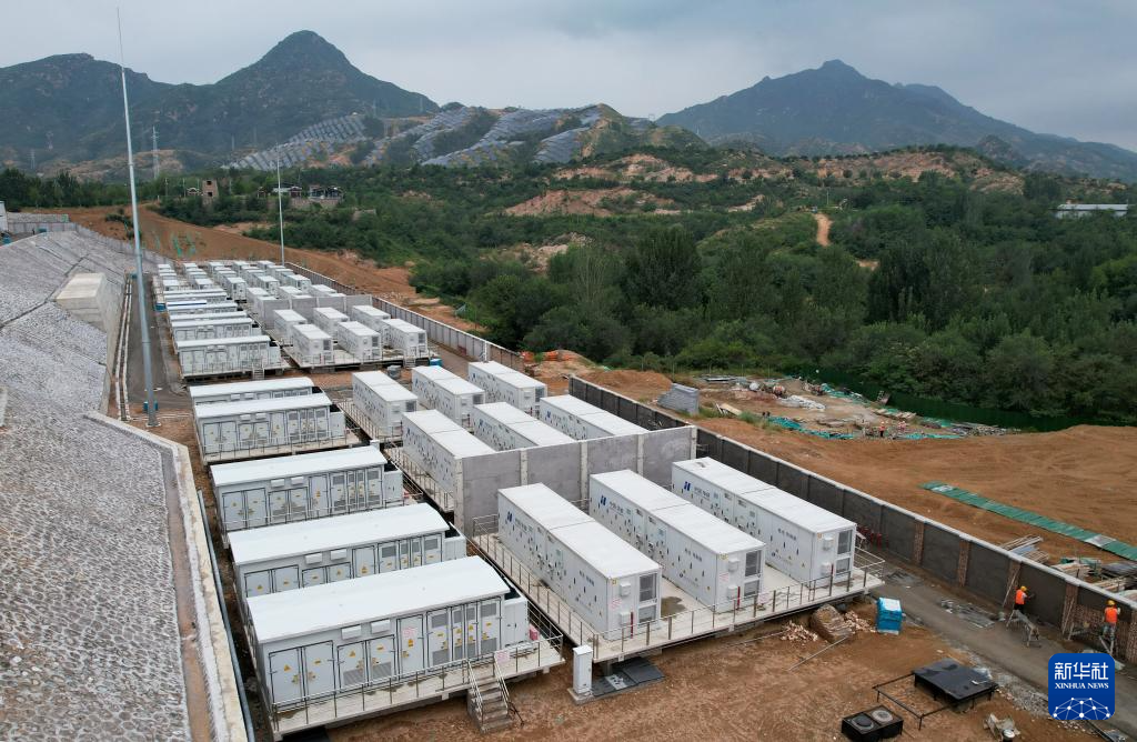 9月10日,工人在位于河北省平山县的西柏坡百兆瓦级新型电力系统示范工程建设工地施工(无人机照片)。