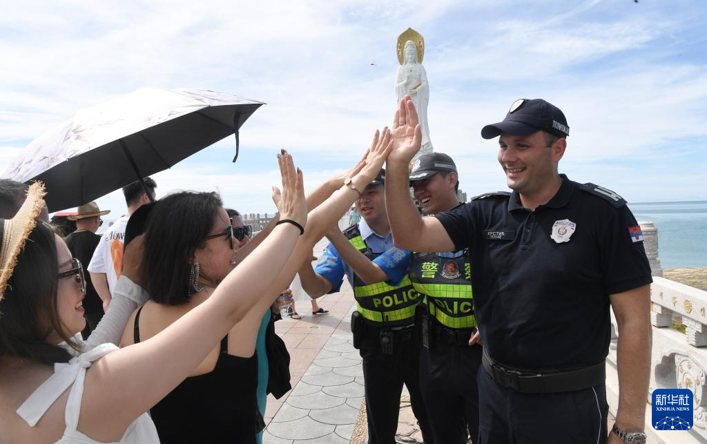 9月12日,在三亚市南山文化旅游区,中国和塞尔维亚警务联合巡逻队在执行任务时与游客交流互动。