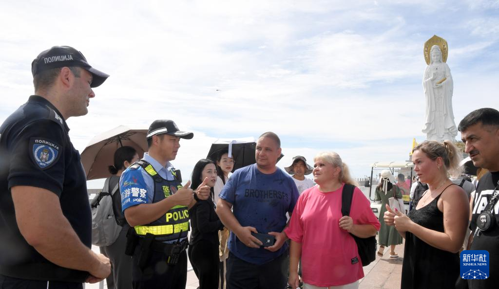 9月12日,在三亚市南山文化旅游区,中国和塞尔维亚警务联合巡逻队在执行任务时与游客交流。
