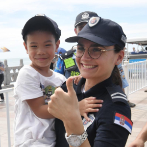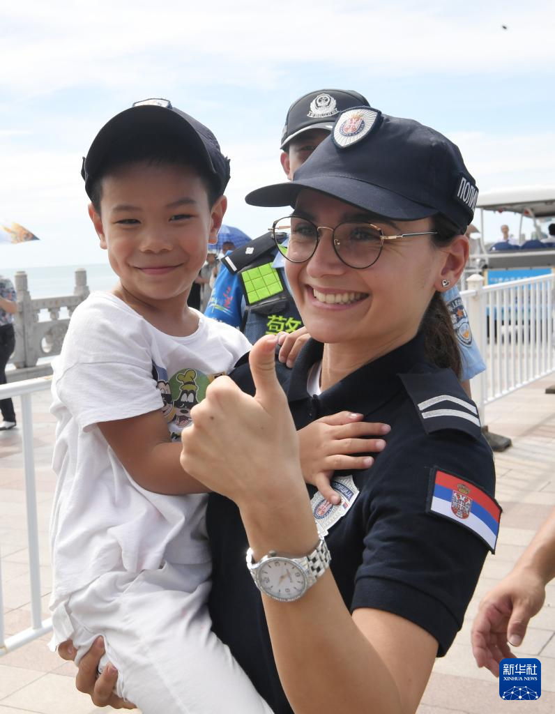9月12日,在三亚市南山文化旅游区,中国和塞尔维亚警务联合巡逻队在执行任务,塞方警察与一名中国小游客合影。