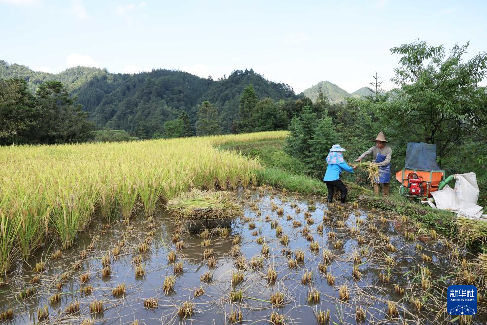 梁安合(左)和老伴梁英迷上山收割稻谷(2024年9月11日摄)。