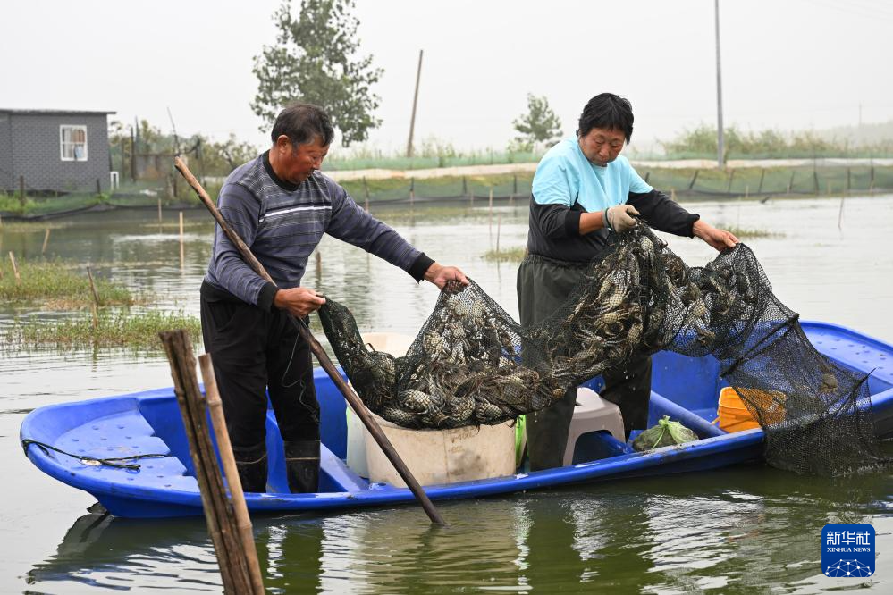 9月13日,在蚌埠市五河县沱湖乡大岗村,蟹农在捕捞螃蟹。