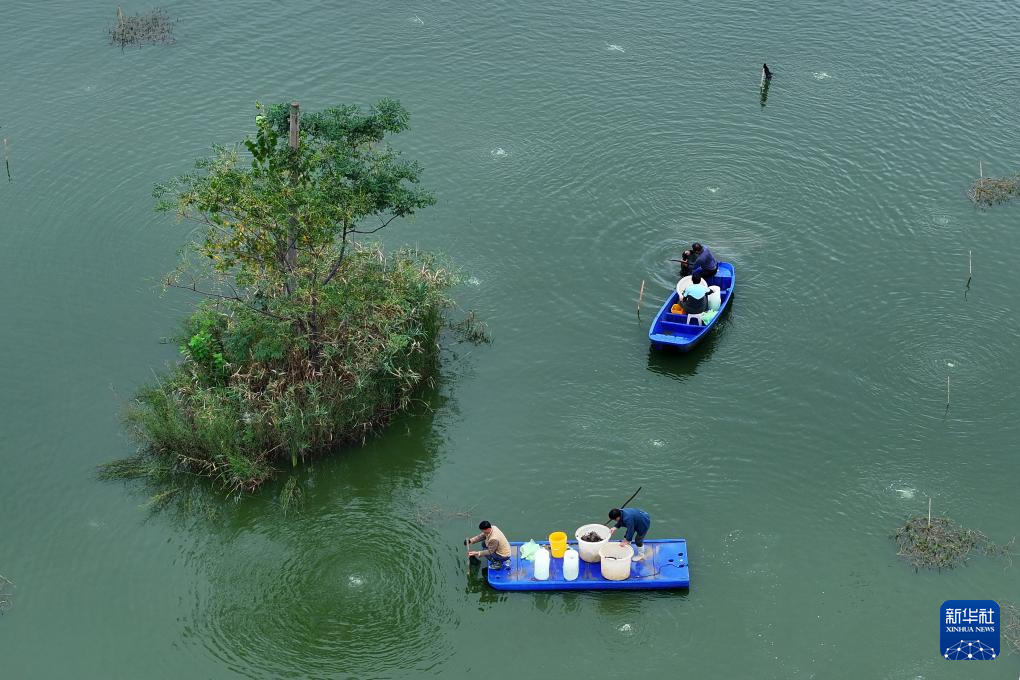 9月13日,在蚌埠市五河县沱湖乡大岗村,蟹农在捕捞螃蟹(无人机照片)。