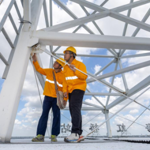 9月13日,房建巡检工在上海虹桥火车站屋顶上作业。