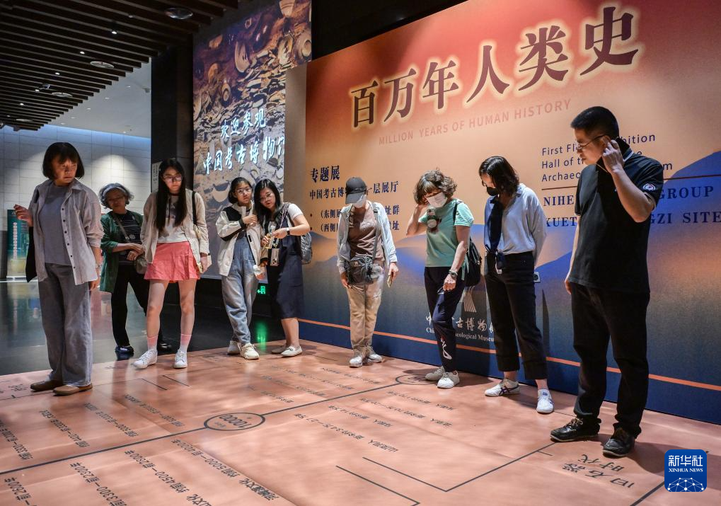9月14日,观众们流连在中国考古博物馆序厅地面“历史大道”起点。
