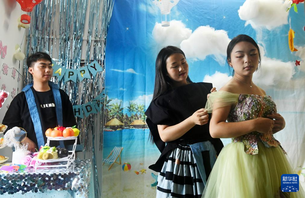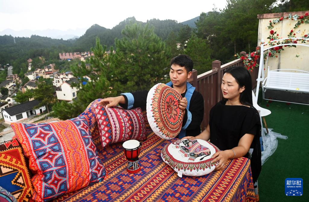 在广西南丹县里湖瑶族乡朵努社区“千家瑶寨·万户瑶乡”易地扶贫搬迁安置点,黎玲(右)和爱人黎明布置拍照场景(9月11日摄)。