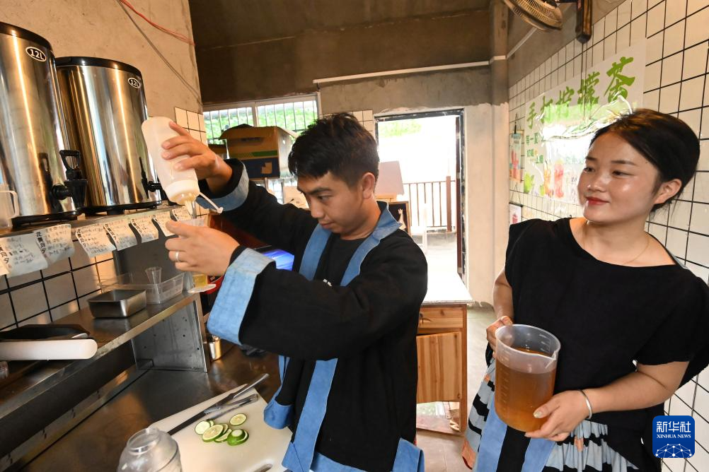 在广西南丹县里湖瑶族乡朵努社区“千家瑶寨·万户瑶乡”易地扶贫搬迁安置点,黎明(左)和爱人黎玲制作柠檬茶(9月11日摄)。