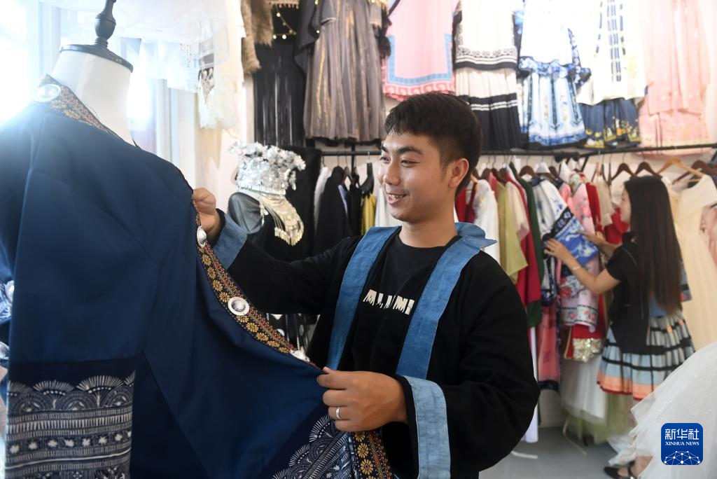 在广西南丹县里湖瑶族乡朵努社区“千家瑶寨·万户瑶乡”易地扶贫搬迁安置点,黎玲(中)帮客人整理服装(9月11日摄)。