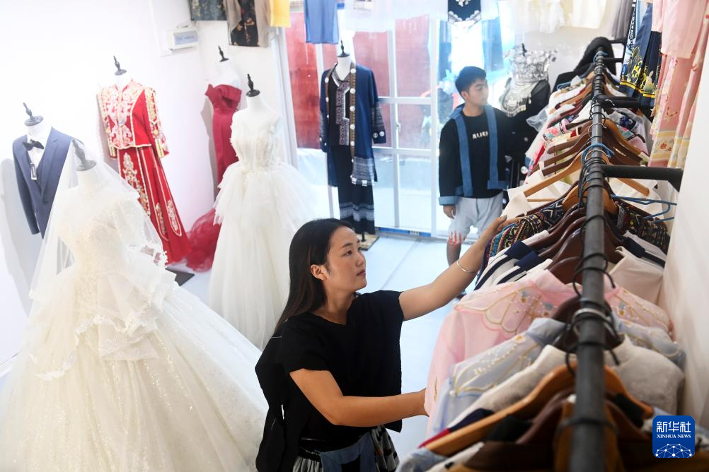 在广西南丹县里湖瑶族乡朵努社区“千家瑶寨·万户瑶乡”易地扶贫搬迁安置点,黎玲(左)帮客人挑选服装(9月11日摄)。
