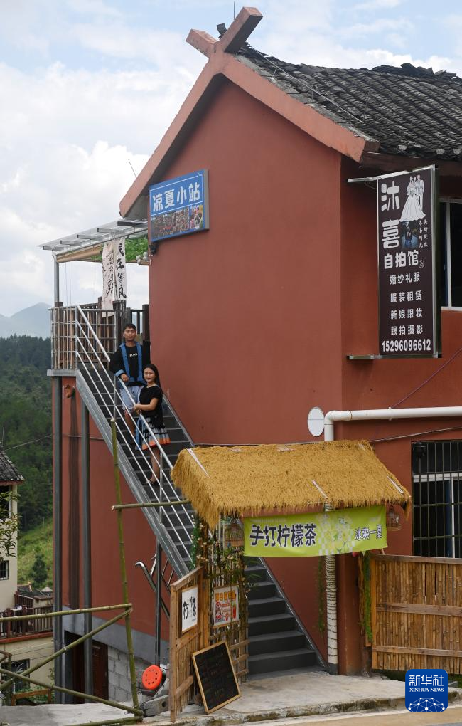 在广西南丹县里湖瑶族乡朵努社区“千家瑶寨·万户瑶乡”易地扶贫搬迁安置点,黎玲(右)和爱人黎明在创业的门店外(9月11日摄)。