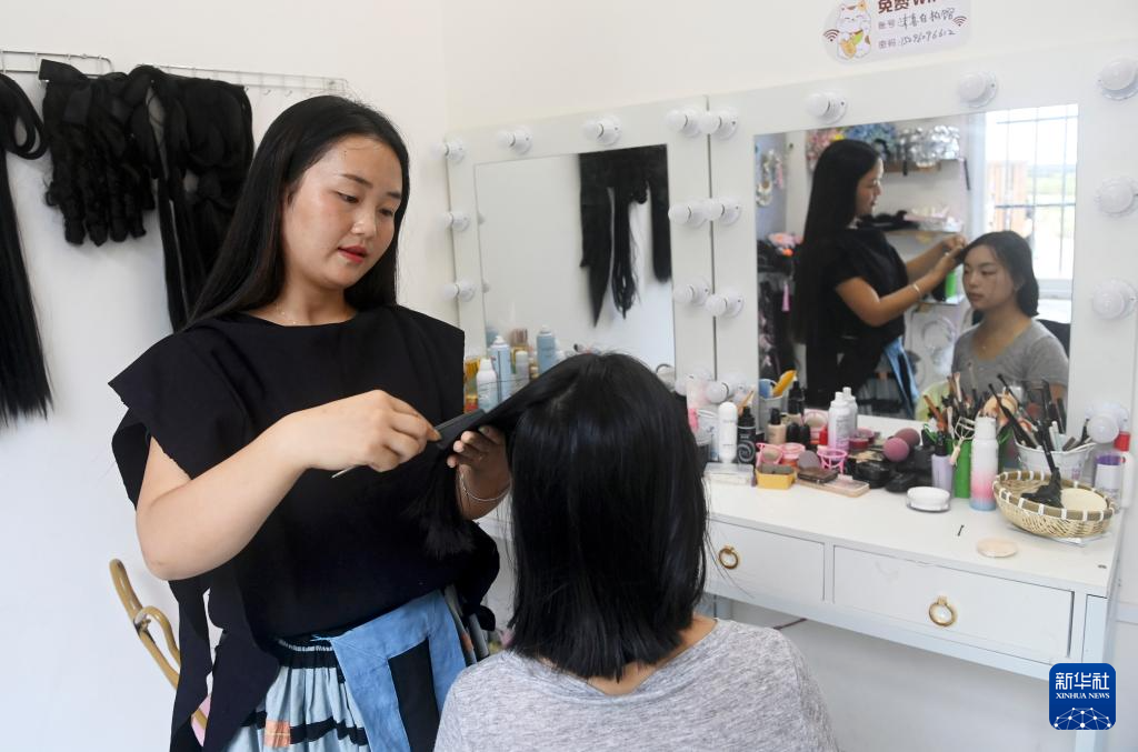 在广西南丹县里湖瑶族乡朵努社区“千家瑶寨·万户瑶乡”易地扶贫搬迁安置点,黎玲(左)为客人化妆(9月11日摄)。
