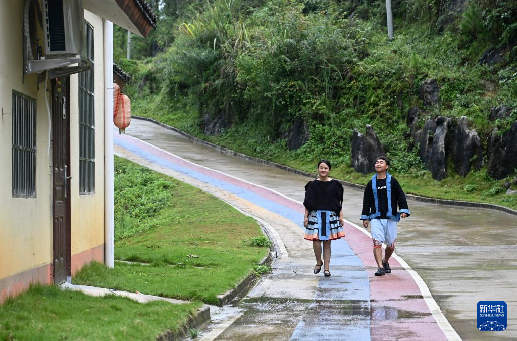 在广西南丹县里湖瑶族乡朵努社区“千家瑶寨·万户瑶乡”易地扶贫搬迁安置点,黎玲(左)和爱人黎明走在安置点内(9月11日摄)。