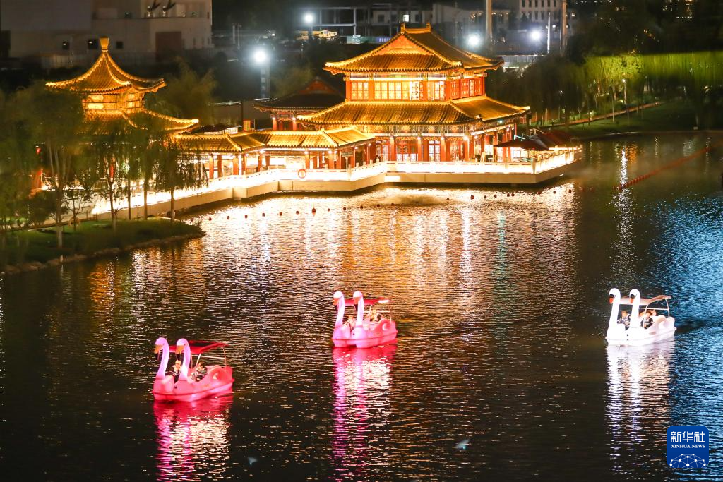 9月13日,游客在兰州市雁滩公园内的湖面上乘船夜游。