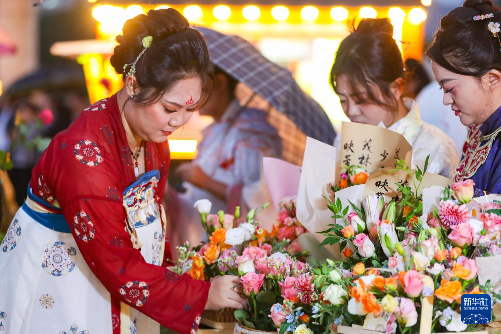 9月13日,在兰州市雁滩公园,身着汉服的青年志愿者展示插花技艺。