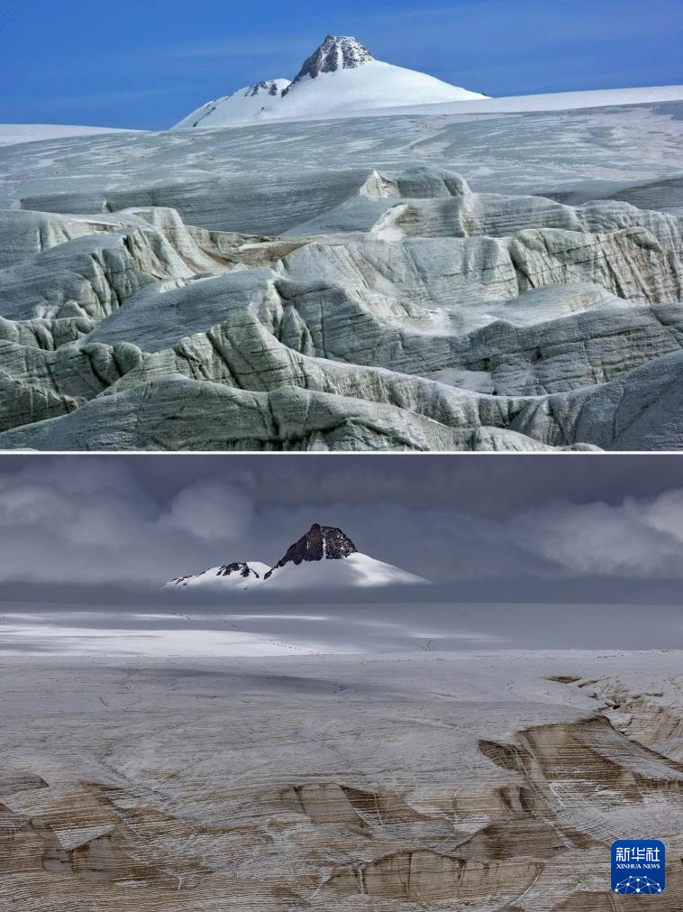 拼版照片:上图为2009年6月拍摄的普若岗日主峰(新华社发 车刚摄);下图为2024年9月4日拍摄的普若岗日主峰(新华社记者姜帆摄)。对比可以看出普若岗日主峰下的冰原消融严重。