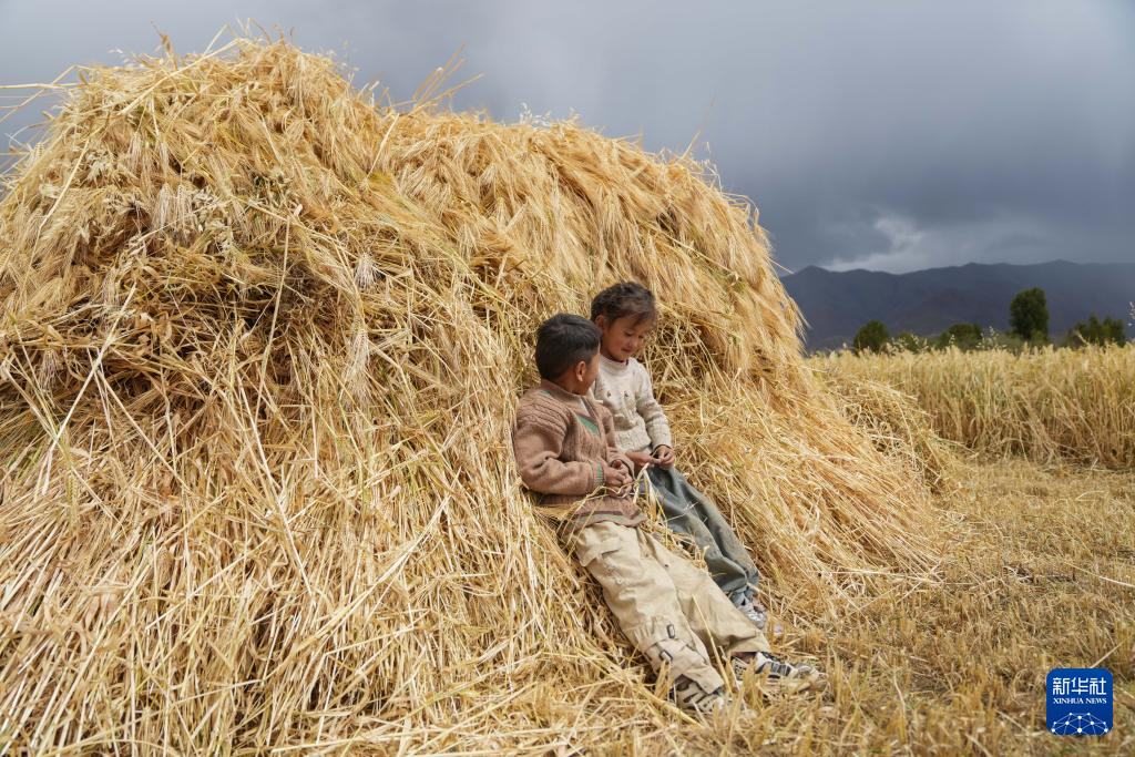 9月10日,在西藏日喀则市白朗县巴扎乡,孩子们靠在青稞垛上玩耍。