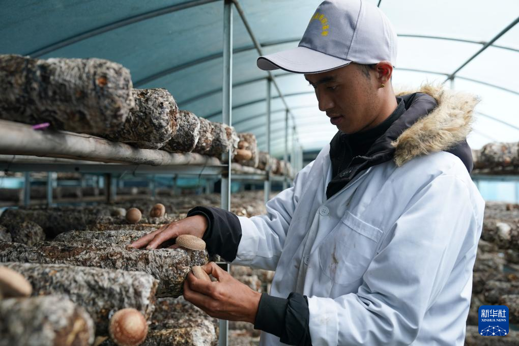9月13日,在理塘县现代农业园区香菇基地内,工作人员在采摘香菇。该基地年产鲜菇60万斤。