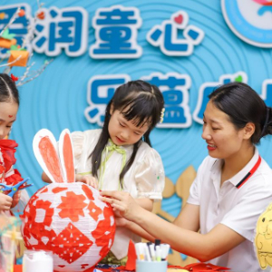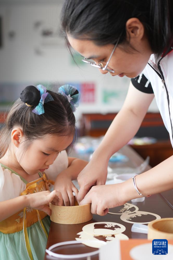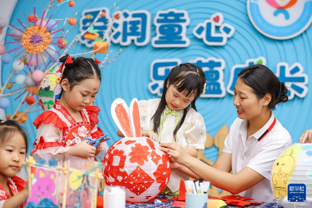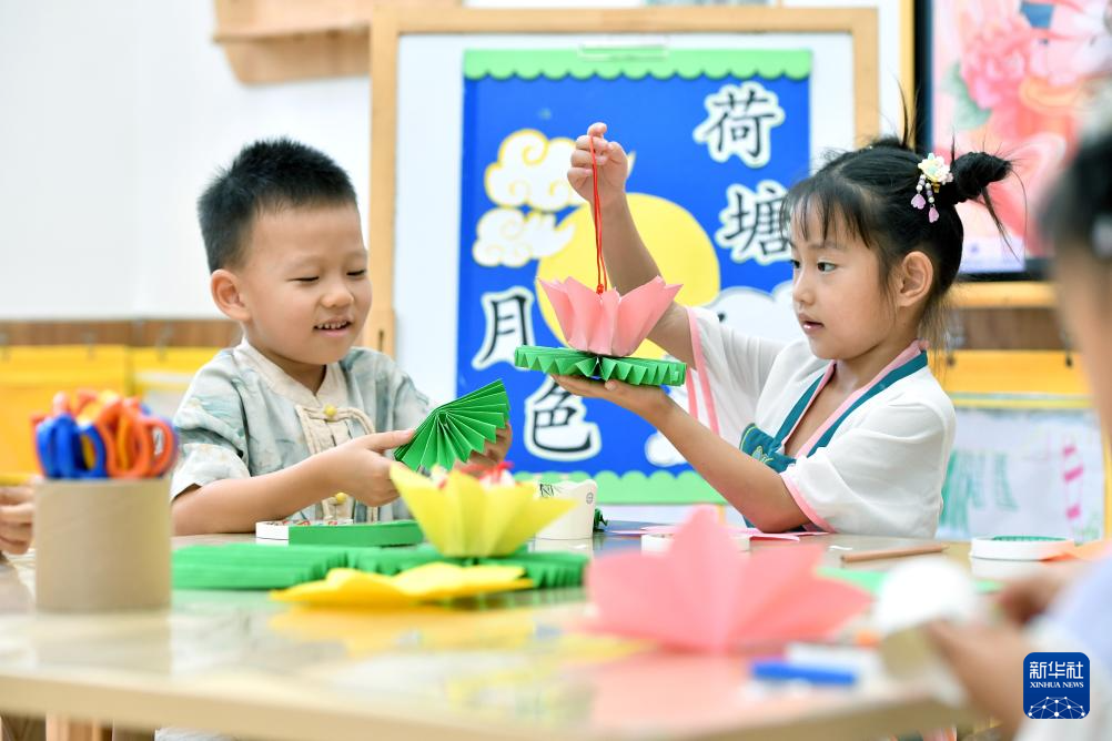 9月14日,在山东省青岛市李沧区夏庄路幼儿园,老师指导小朋友制作花灯。